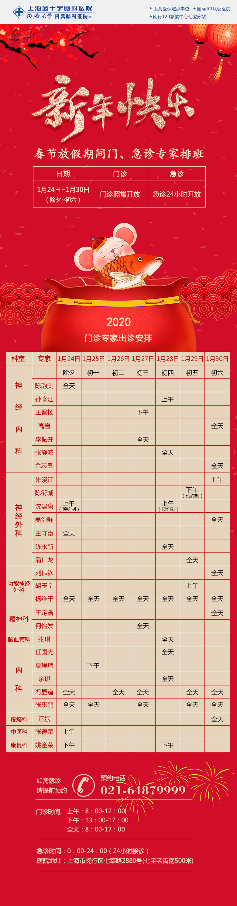 歲月崢嶸逢子鼠,江山錦繡傾庚年。2020年春節(jié)將至,感謝您一直以來對上海藍(lán)十字腦科醫(yī)院的信任和支持。為確保春節(jié)放假期間(2020年1月24日至1月30日)患者能夠正常就診,我院門診部、急診科將照常開診,F(xiàn)將我院春節(jié)放假期間門、急診工作安排如下: