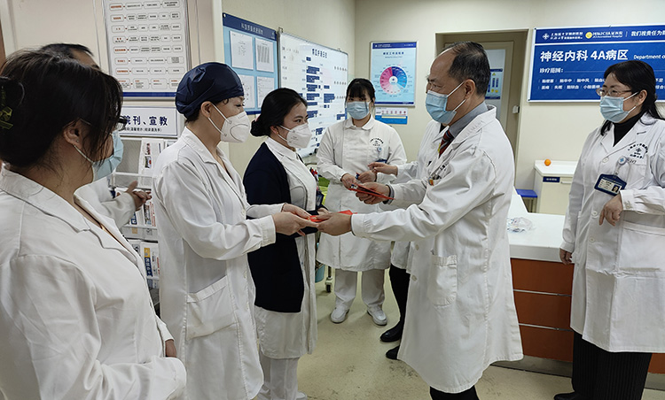 殷殷祝福道不盡,一言一行總關(guān)情。“大家新年好,你們辛苦了,給大家拜年啦!”每到一處,院領(lǐng)導(dǎo)向堅(jiān)守崗位的職工們拜年,感謝大家待患如親、以院為家的執(zhí)著堅(jiān)守與辛苦付出,并與大家親切握手交談、詳細(xì)了解病區(qū)患者情況、叮囑大家格外注意春節(jié)假期期間的診療、護(hù)理等各項(xiàng)工作,尤其要緊繃安全弦,一刻不松懈。