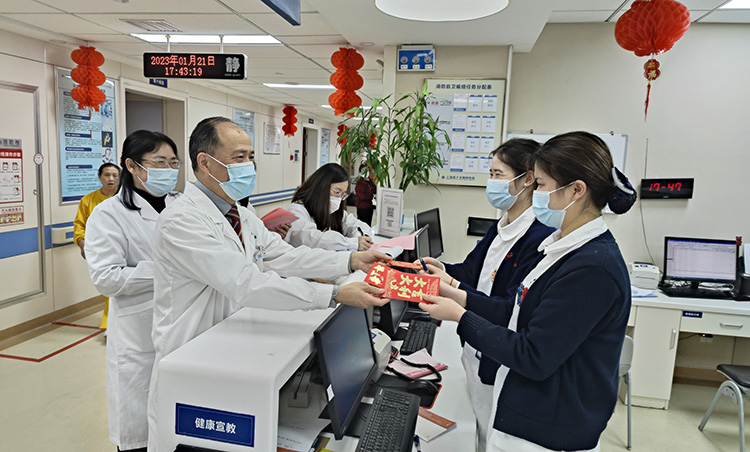 卯兔迎春,喜辭舊歲。2023年1月21日,農(nóng)歷除夕,院長(zhǎng)項(xiàng)耀鈞等院領(lǐng)導(dǎo)攜行政總值班、護(hù)理總值班等深入各科室各部門,親切慰問(wèn)堅(jiān)守崗位的醫(yī)務(wù)人員和后勤保障人員,將新年紅包、慰問(wèn)信送到大家手中。