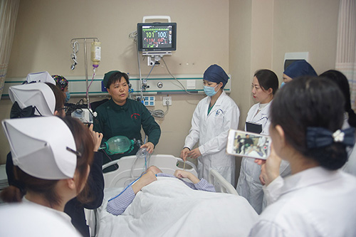 ▲潘水云護(hù)士長演示培訓(xùn)《危重患者搶救應(yīng)急預(yù)案》