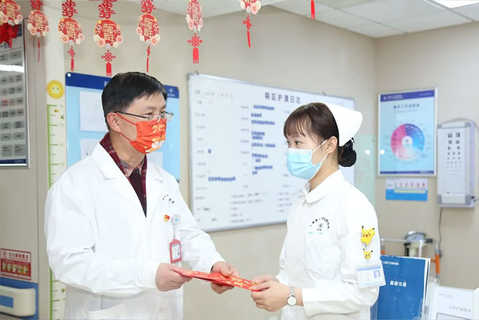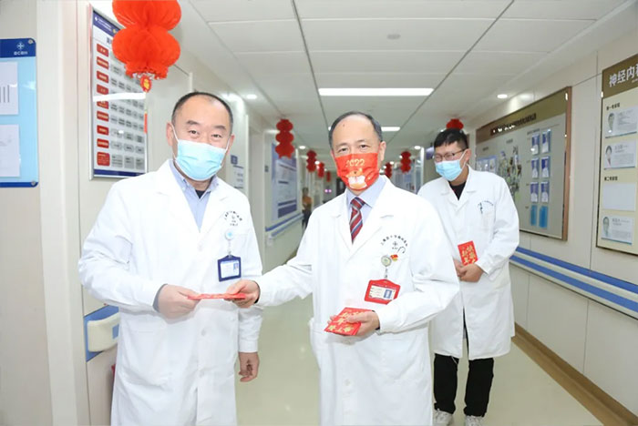 為生命開路者,不可使其困頓于荊棘。1月31日下午五時(shí),總經(jīng)理兼黨支部書記朱敏、院長(zhǎng)項(xiàng)耀鈞攜吳春芳、周克祥、郭榮峰等院領(lǐng)導(dǎo),深入各科室,親切慰問(wèn)值守人員,送上新年紅包、慰問(wèn)信和美味盒飯。院領(lǐng)導(dǎo)的關(guān)懷如春風(fēng)化雨,滋潤(rùn)心田,讓所有人如沐春風(fēng),倍感溫暖。