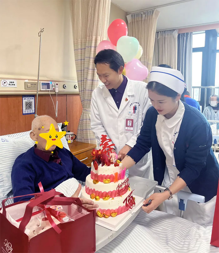 那些深夜查房時掖好的被角、晨間護理中反復調(diào)整的枕頭高度,此刻都凝結成蛋糕上的祝愿。白衣天使的關懷,不僅治愈病痛,更在守護歲月長河里的微光。