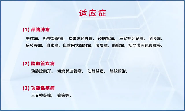 醫(yī)院引進的瑪西普MASEP SRRS型伽瑪射線頭部立體定向放射外科治療系統(tǒng),是一種融合現(xiàn)代計算機技術(shù)、立體定向技術(shù)和外科技術(shù)于一體的治療性設(shè)備。具有定位精準(zhǔn)、治療精準(zhǔn)、靶區(qū)劑量集中,周圍正常組織受照劑量低的特點,可以使腫瘤局部得到準(zhǔn)確的高劑量照射,避免腫瘤周圍正常組織的損傷。能在縮短治療時間的基礎(chǔ)上,較大限度地保護患者不受額外輻射傷害。其適應(yīng)癥十分廣泛,涵蓋了: