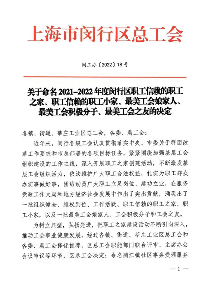 近日,上海市閔行區(qū)總工會下發(fā)《關(guān)于命名2021-2022年度閔行區(qū)職工信賴的職工之家、職工信賴的職工小家、最美工會娘家人、最美工會積極分子、最美工會之友的決定》文件,上海藍十字腦科醫(yī)院總經(jīng)理兼黨支部書記朱敏榮獲閔行區(qū)“最美工會之友”稱號。