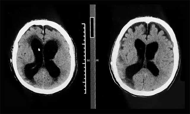 ▲ 術(shù)前(左)和出院前(右)CT比對,患者原先擴(kuò)張的腦室已縮小,癥狀改善明顯