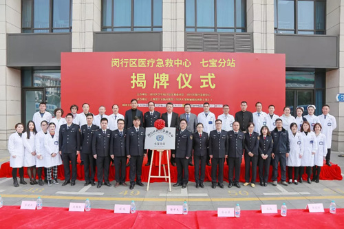 閔行區(qū)衛(wèi)計(jì)委副主任程佳(右五)、醫(yī)療急救中心主任徐中杰(左五)、副主任蔣超(右三)、上海市腦卒中院前急救主任委員劉建民(左四)、上海藍(lán)十字腦科醫(yī)院黨支部書記朱敏(右四)、院長項(xiàng)耀鈞(左三)等領(lǐng)導(dǎo)為七寶分站正式揭牌