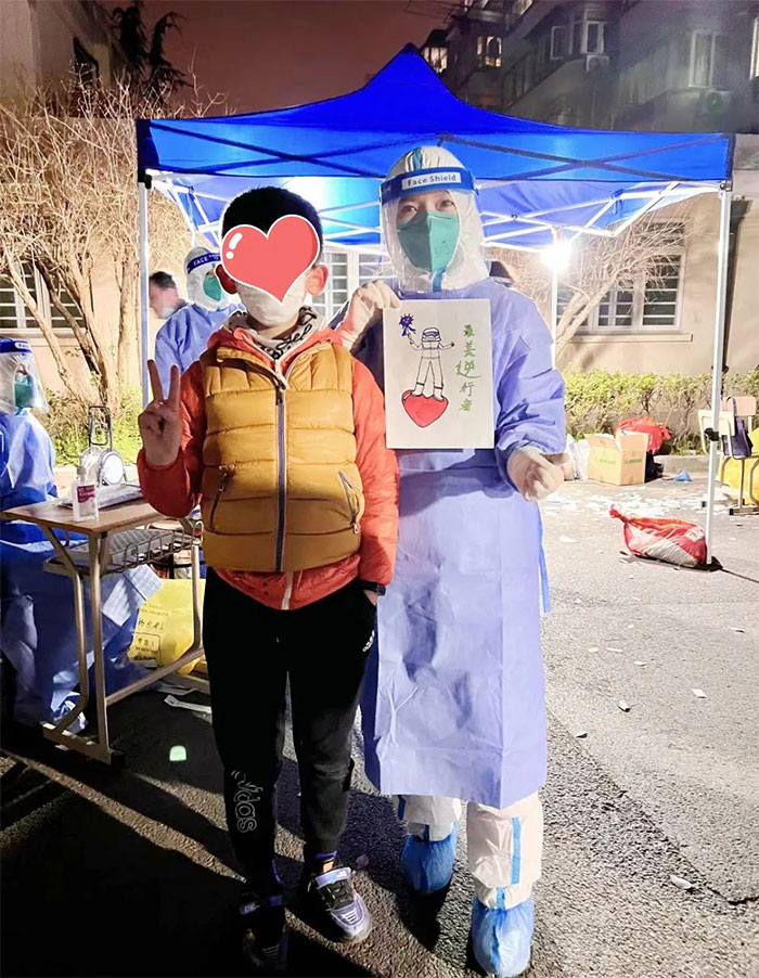 后來(lái)他告訴我,知道今天采核酸,他下午就一直在家里畫(huà)。畫(huà)好了看我們還在忙,就一直等著,說(shuō)怕打擾到我們。等一會(huì)不放心,怕我們走了,就來(lái)看一下,一直等了一個(gè)多小時(shí)。直到最后,我們剛結(jié)束,他就立刻送了過(guò)來(lái)。“是你們的付出才讓我們能夠安心在家”,他悄悄在我耳邊說(shuō)。