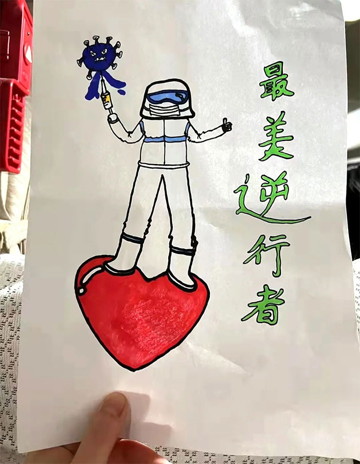 今天收到了一份暖心的禮物——一幅手繪畫(huà)。上面畫(huà)了一個(gè)“大白”,踩在一顆大大的紅心上,右手舉著一個(gè)扎著病毒的大針筒,右邊寫(xiě)著一行綠色的大字——“最美逆行者”。小朋友告訴我,畫(huà)上這個(gè)“大白”就是我。其實(shí),我心里知道,他心中的“大白”應(yīng)該并不只是我,而是所有穿著“大白裝”的人,只是碰巧讓我遇上了。