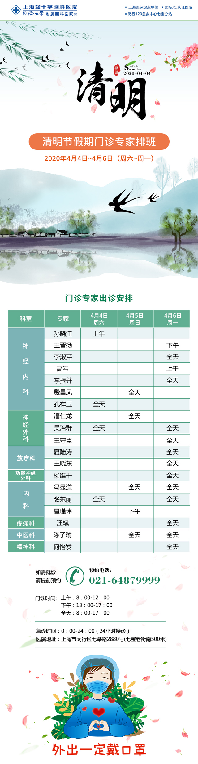 2020年清明節(jié)假期將至,我院為方便患者節(jié)假日期間就診,4月4日(周六)—4月6日(周一)我院門(mén)診照常開(kāi)放,各檢查項(xiàng)目照常開(kāi)放。具體門(mén)診安排如下所示: