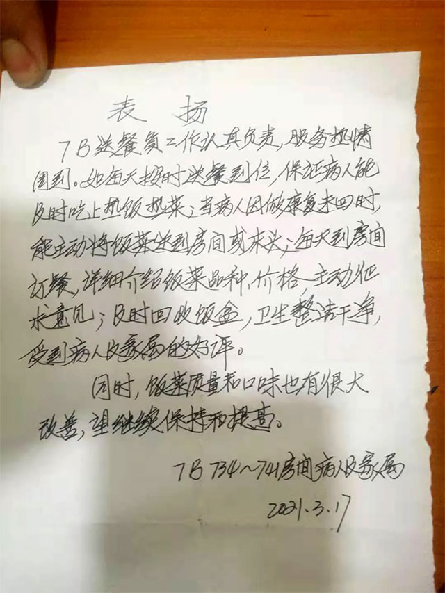 “我今天要表揚的是食堂7樓的送飯小哥:小徐。小徐的特點是,1. 人聰明,2. 為人熱情和責(zé)任性(心)強(qiáng),3. 顧全大局能吃虧......最后說一下顧全大局能吃虧。很多病人或陪客,經(jīng)常是只考慮自己的利益和方便,提出兩天一定餐,或三天一定餐,小徐都能夠做到不厭其煩和顧全大局,并且,當(dāng)病人和陪客表示,不好意思的時候,他都會安慰對方,說這些都是他的工作,勸對方不要不好意思。所以,我們幾乎每天都可以看到,在小徐已經(jīng)將飯菜分發(fā)完后,還在多個病房里往返奔忙,變更訂單和收款,忙的不亦樂乎。......”
