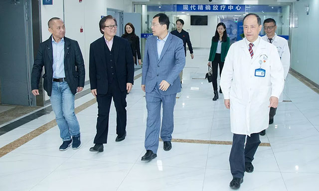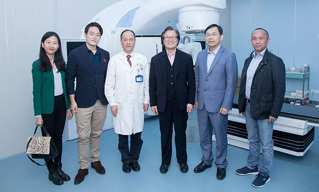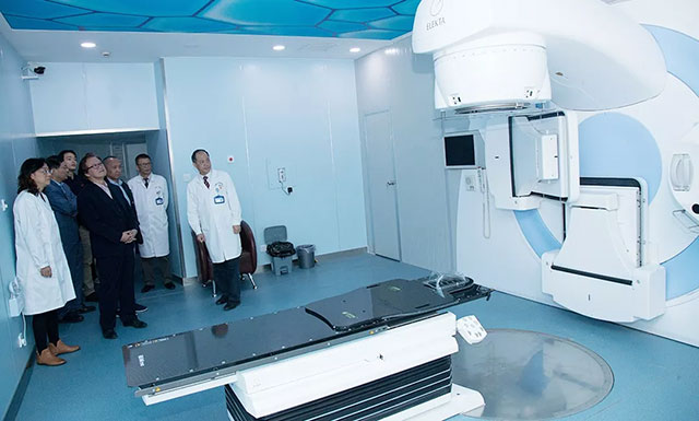 在重點(diǎn)科室中,Mark Wen一行最后參觀了精準(zhǔn)放療溫馨的診療環(huán)境,進(jìn)入機(jī)房實(shí)地考察了中心最新引進(jìn)的瑞典醫(yī)科達(dá)Elekta第六代全數(shù)字化加速器。精準(zhǔn)放療王曉東主任介紹說,瑞典醫(yī)科達(dá)公司是全球精準(zhǔn)放療的領(lǐng)導(dǎo)者,醫(yī)院引進(jìn)的這臺(tái)設(shè)備是當(dāng)前精準(zhǔn)放療的主流設(shè)備,它完全符合以“三精”(精準(zhǔn)定位、精準(zhǔn)計(jì)劃、精準(zhǔn)治療)為特征的高能X射線放射治療新技術(shù)的發(fā)展,可滿足大部分放射治療技術(shù)及高級(jí)應(yīng)用,如三維適形放療(3DCRT)、調(diào)強(qiáng)放療(IMRT)、容積旋轉(zhuǎn)調(diào)強(qiáng)治療(VMAT)、立體定向放療(SRT)等?芍委燁^頸部腫瘤、胸部腫瘤、腹部腫瘤等全身各部位腫瘤,以及各種轉(zhuǎn)移瘤,治療精準(zhǔn)、預(yù)后良好、并發(fā)癥少,單次治療時(shí)間僅需2-6分鐘,可廣泛適用于絕大多數(shù)腫瘤患者。
