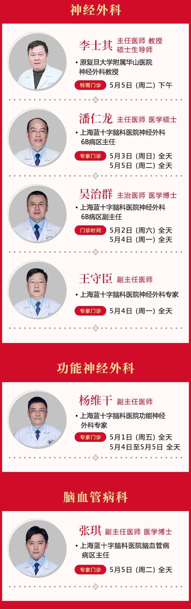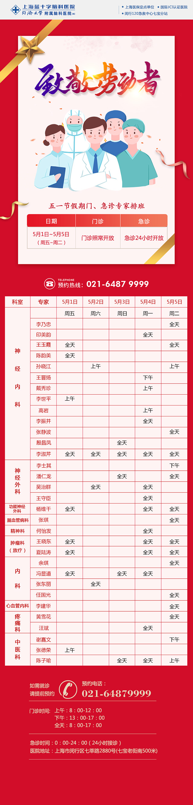 尊敬的廣大市民:您好!為滿足廣大患者朋友在節(jié)假日期間的就醫(yī)需求,提供便捷的診療服務,在五一節(jié)期間,即5月1日(周五)—5月5日(周二),我院門、急診照常開診,各檢查項目照常開放。具體門、急診安排如下: