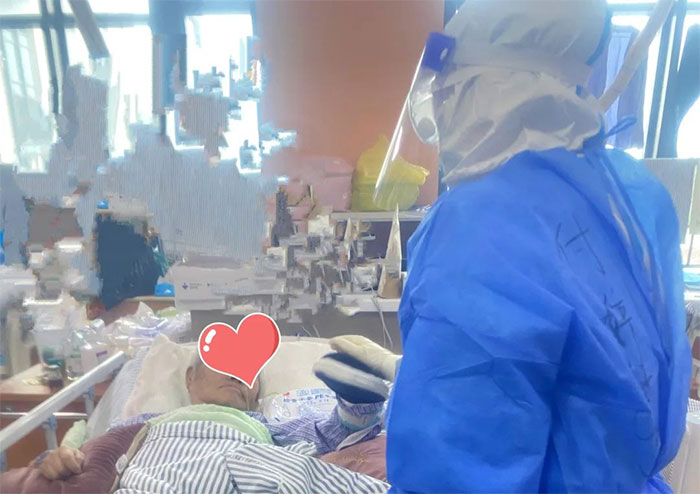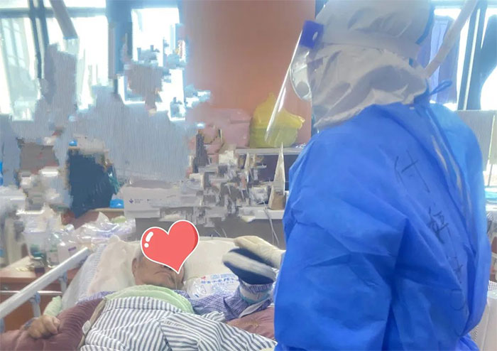 可即便深深的壓痕、疲憊的神態(tài),也擋不住醫(yī)者之美;堅(jiān)毅的目光,依然透射著患者在她們心中第一位的堅(jiān)定信念。病區(qū)內(nèi)55歲的謝某,因右側(cè)腦梗和肺氣腫于3月19日入院,當(dāng)時(shí)患者不能言語,無法行走,由他愛人照顧,她愛人感染病毒后外出隔離治療,護(hù)理團(tuán)隊(duì)就承擔(dān)起“家屬”的責(zé)任,給他喂飯、翻身擦身、處理大小便,待他愛人半個(gè)月隔離康復(fù)回來,看到能開口說話又能下地行走的謝某時(shí),抱住正在病房照顧的護(hù)士宋會敏情不自禁地哭起來,激動(dòng)得難以言表。