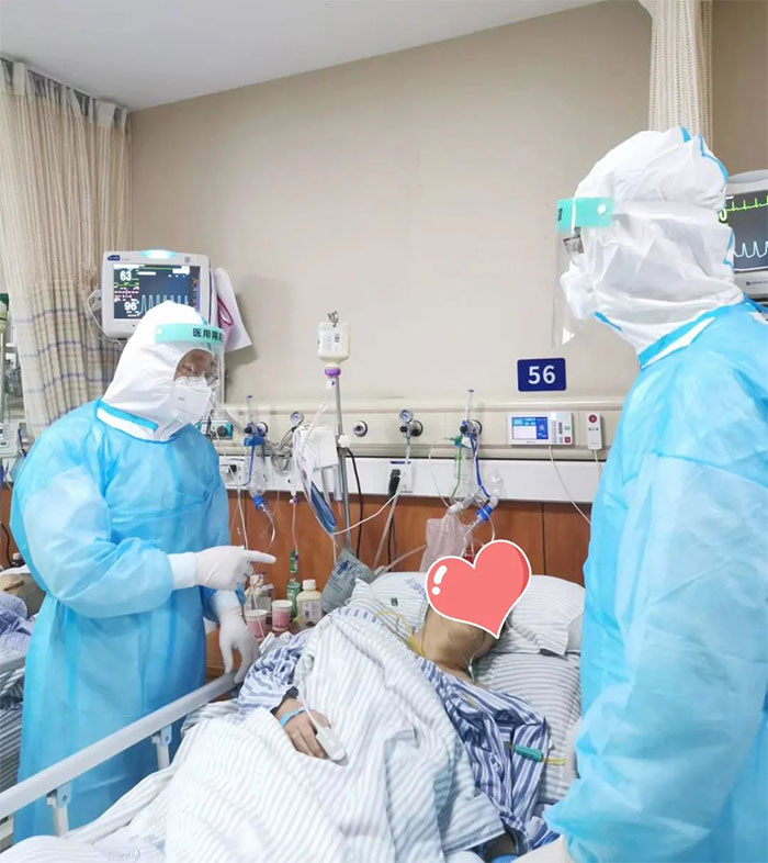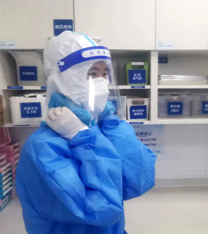 雖然層層防護阻擋了病毒的侵襲,卻也大大降低了護理工作效率。胸悶、喘不上氣,像來到了太空漫步,步履蹣跚,原本那些得心應手的護理操作,都得花上兩倍、三倍乃至更多的時間和專注度才能完成。即便工作已非常緊張忙碌,她們仍努力擠出時間,少喝一次水、少上一趟廁所,也要為行動不便的患者及時送飯送水、噓寒問暖,同時不忘安撫患者的情緒。