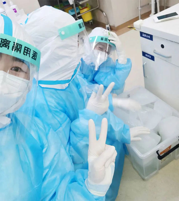 ▲ 防護服悶熱異常,護士們用冰袋降溫
