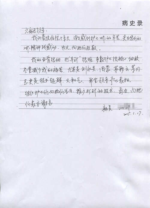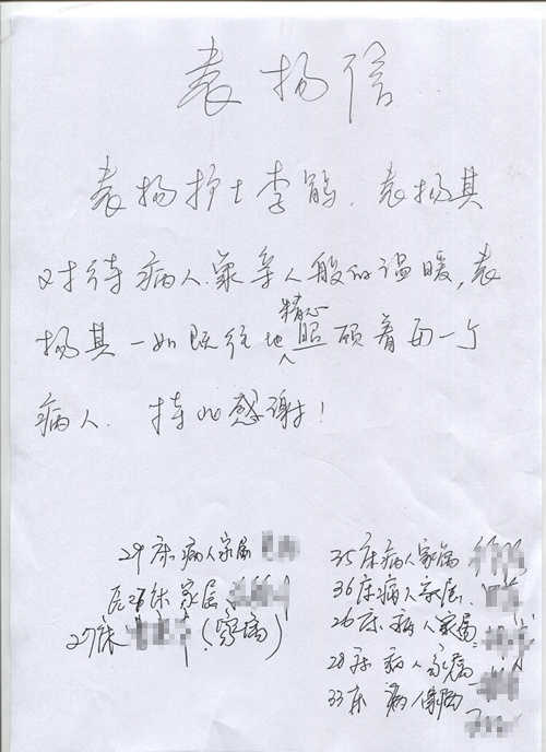 患者家屬寫(xiě)信表?yè)P(yáng)醫(yī)院護(hù)士