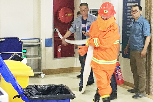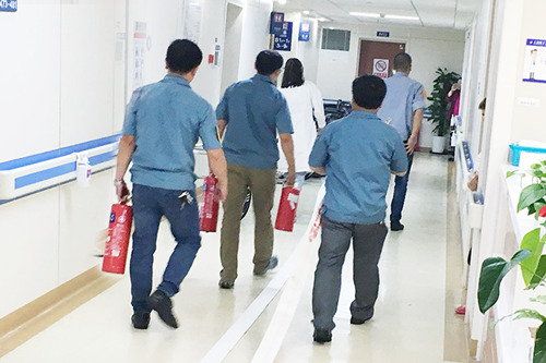 吳春芳總指揮接到報警電話后第一時間趕到消控中心應(yīng)急指揮,組織總務(wù)科、保安隊等組成的滅火行動小組及由科主任和醫(yī)務(wù)人員組成的現(xiàn)場疏導(dǎo)小組滅火、救援,并引導(dǎo)病人安全疏散及轉(zhuǎn)移。鑒于火勢過大,總指揮吳春芳隨即緊急協(xié)調(diào)醫(yī)院消防應(yīng)急隊伍,消防應(yīng)急小分隊集合、裝備并在3分鐘內(nèi)趕到火災(zāi)現(xiàn)場,并就近啟用消防栓,及時控制火情,最終將火撲滅。