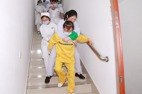 與此同時,為了增加演練的真實性,進行演練的兩個病區(qū)5A和4B,分別有5名特殊的病人“潛入”病區(qū),他們由醫(yī)院的后勤工作人員扮演。鑒于腦病患者的特殊性,有的癱瘓在床、神志不清,有的肢體偏癱、行動不便……這些扮演的病人均真實還原了病區(qū)患者的情況,佩戴綠袖標(biāo)分布于各病房等待救援。我院醫(yī)務(wù)人員及救援小組配合默契,采用“抬、背、抱、扶”等方式成功將這10位特殊的病人成功轉(zhuǎn)移。