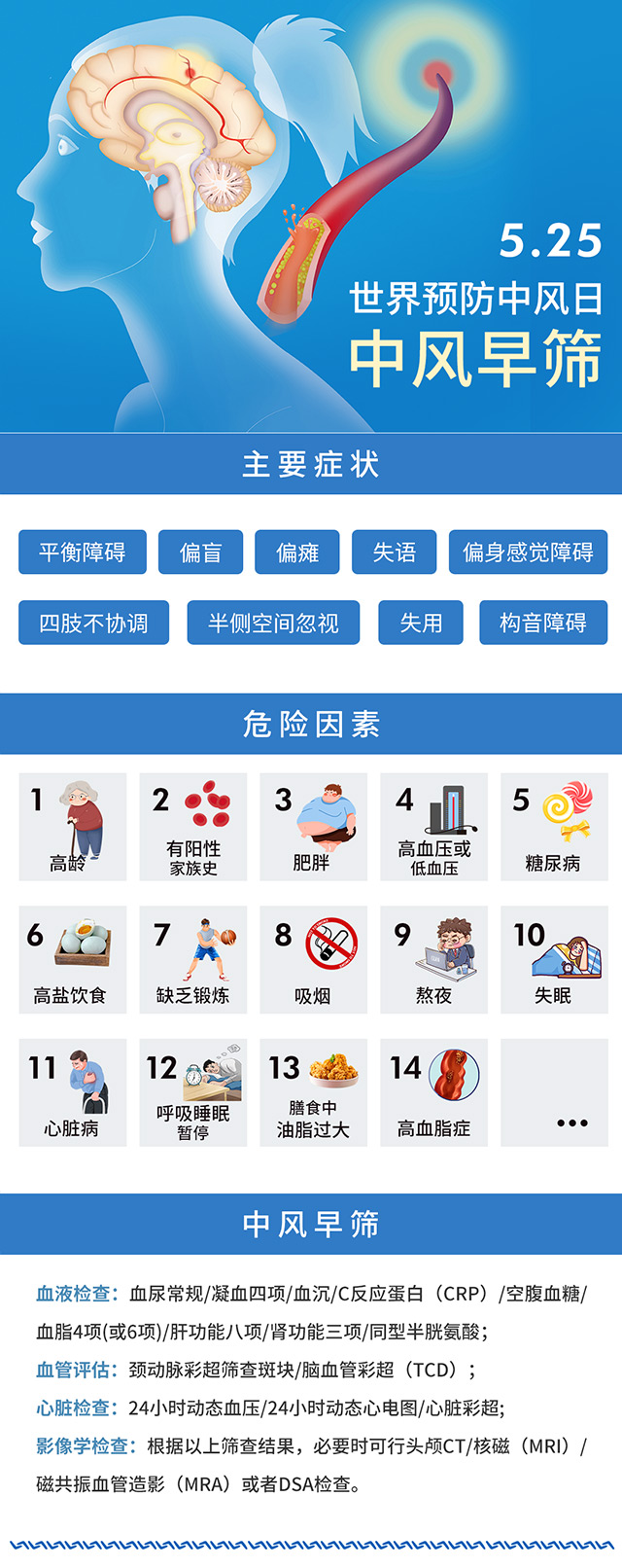 今年5月25日是第15個(gè)“世界預(yù)防中風(fēng)日”。“腦卒中”(Cerebral Stroke) 又稱(chēng)“中風(fēng)”、“腦血管意外”(Cerebral Vascular Accident,CVA),是由于腦血管突然發(fā)生破裂出血或因血管堵塞造成大腦缺血、缺氧而引起。腦卒中具有高發(fā)病率、高復(fù)發(fā)率、高致殘率、高死亡率的“四高”特點(diǎn),是我國(guó)居民健康的“第一殺手”,給患者、家庭及全社會(huì)帶來(lái)沉重負(fù)擔(dān)。