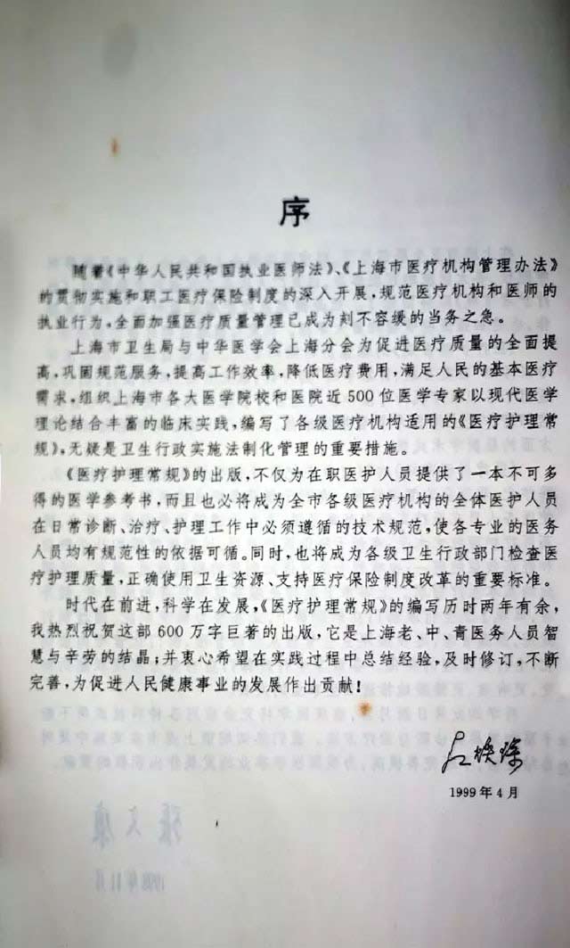 ▲ 時(shí)任上海市副市長(zhǎng)左煥琛為《內(nèi)科診療常規(guī)》作序