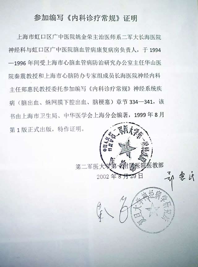 1994年至1996年間,受上海市心腦血管病防治研究辦公室主任華山醫(yī)院秦震教授和上海市心腦防辦專家組成員——長(zhǎng)海醫(yī)院神經(jīng)科內(nèi)科主任鄭惠民教授委托,姚金榮參加編寫了全上海市第一本專著——《內(nèi)科診療常規(guī)》神經(jīng)系統(tǒng)疾病(急性腦血管病、腦出血、蛛網(wǎng)膜下腔出血、腦梗死)章節(jié),由上?茖W(xué)技術(shù)出版社出版,1999.8(1)334-341;