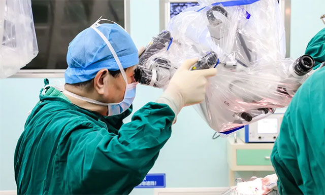 ▲ 借助蔡司顯微鏡(雙熒光),沈教授開展高難度手術