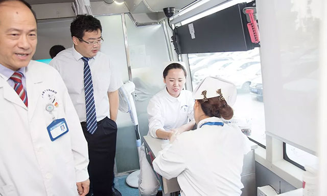 ▲ 朱敏書記(左二)與項耀鈞院長(左一)登上采血車看望無償獻(xiàn)血員工
