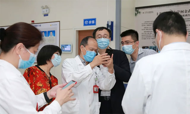 ▲ 上海市衛(wèi)健委主任鄔驚雷(前排右)一行抵達醫(yī)院