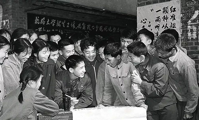 ▲ 1977年中國恢復(fù)高考,南京高考學(xué)生考前表決心。(許明義/攝 圖片源自網(wǎng)絡(luò))
