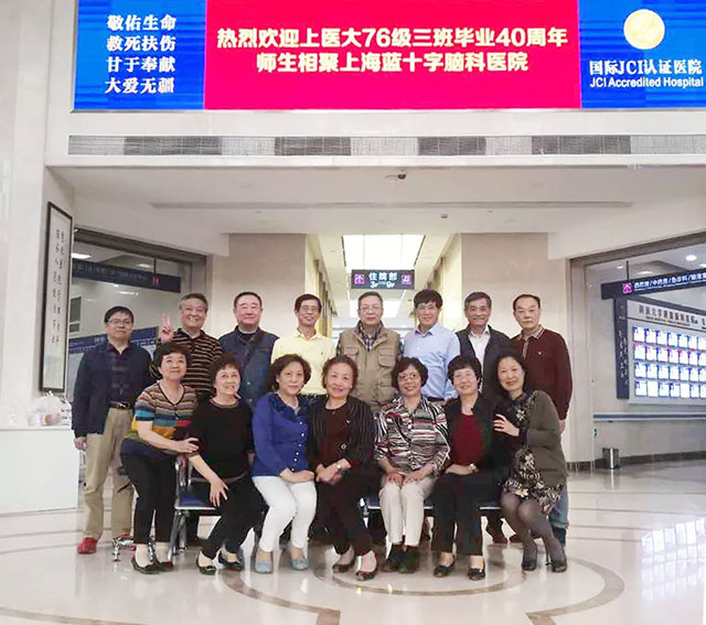 這是2018年6月6日上午,原上海市副市長、上海市政協(xié)原副主席左煥琛女士,帶領(lǐng)中國人民政治協(xié)商會議上海市委員會上海政協(xié)之友醫(yī)衛(wèi)體組25人蒞臨上海藍(lán)十字腦科醫(yī)院調(diào)研座談,當(dāng)她走進(jìn)康復(fù)醫(yī)學(xué)科康復(fù)大廳時,又遇見了闊別20多年的校友姚金榮。
