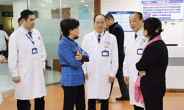 ▲ 2018年12月6日上海市衛(wèi)健委黨委書記黃紅女士(前排左二)參觀調(diào)研康復(fù)科與姚主任親切交談并關(guān)心科室發(fā)展