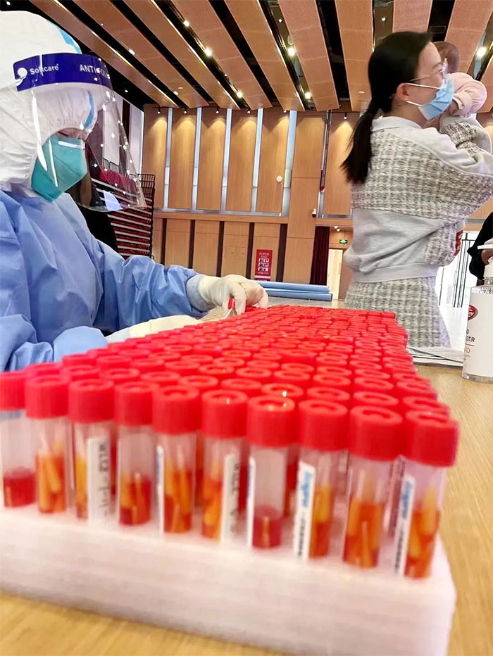 檢驗(yàn)科團(tuán)隊(duì)共有9位工作人員,其中有3人因?yàn)橐咔楸环饪卦谛^(qū),只有6人在崗。團(tuán)隊(duì)減員,工作量陡增,但工作必須保質(zhì)保量完成。他們超負(fù)荷工作,充分發(fā)揚(yáng)著特別能吃苦、特別能戰(zhàn)斗、特別能奉獻(xiàn)的藍(lán)十字精神,持續(xù)戰(zhàn)斗在防控最前沿。