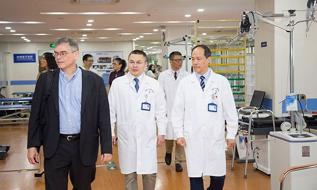 Andreas Heinz教授一行首先參觀了醫(yī)院手術(shù)室。隨后,深入ICU重癥監(jiān)護(hù)病區(qū)、腦血管病區(qū)、神經(jīng)外科、康復(fù)科、高壓氧科、醫(yī)學(xué)影像科、DSA介入科及放療科等特色科室進(jìn)行考察。