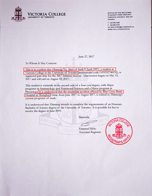 多倫多大學(xué)為許之蒙到藍(lán)十字腦科實(shí)習(xí)交流出具的推薦信