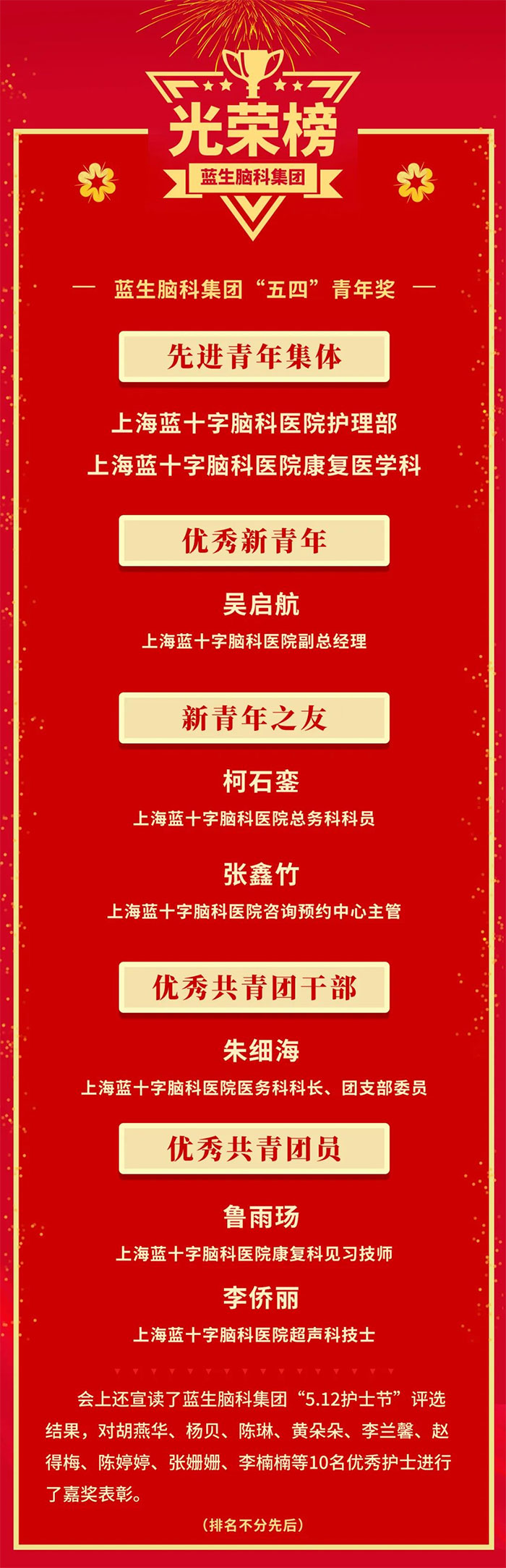 上海藍十字腦科醫(yī)院喜獲多項先進集體和優(yōu)秀個人榮譽表彰。自立院以來,醫(yī)院始終堅持以習(xí)近平新時代中國特色社會主義思想為指導(dǎo),堅持黨建統(tǒng)領(lǐng)促發(fā)展,工團聯(lián)動齊發(fā)力的工作新格局,切實提高政治站位,真正將黨建優(yōu)勢轉(zhuǎn)化為創(chuàng)新優(yōu)勢、競爭優(yōu)勢和發(fā)展優(yōu)勢,形成推動醫(yī)院高質(zhì)量發(fā)展的強大合力,為公司品牌化、連鎖化發(fā)展注入“新勢能”。