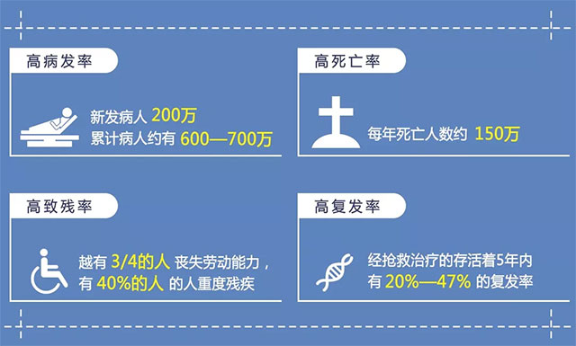 腦卒中俗稱腦中風(fēng),是指由于腦血管堵塞或破裂出血,引起腦循環(huán)障礙和腦組織損害的一組疾病,主要分為缺血性腦卒中和出血性腦卒中,腦卒中具有高發(fā)病率、高致殘率、高復(fù)發(fā)率和高死亡率的“四高”特點(diǎn),已成為國人第一大死亡原因。