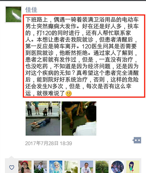 據(jù)了解,作為專業(yè)人員,羅佳第一時(shí)間便給予了這名男士及時(shí)的幫助,比如叮囑現(xiàn)場(chǎng)的人不要隨意搬動(dòng)這名男士,讓他頭轉(zhuǎn)向一側(cè)以免窒息,詳細(xì)觀察他發(fā)作時(shí)的癥狀以便醫(yī)務(wù)人員了解病情及時(shí)進(jìn)行正確的救治,聯(lián)系其家屬了解詳細(xì)病史,囑咐其應(yīng)該及時(shí)進(jìn)行系統(tǒng)的治療......