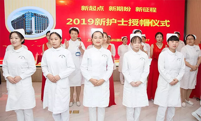授帽儀式是每位新護士踏上護理道路的成人禮,是每位新護士正式成為一名白衣天使的象征。伴隨著莊嚴的樂曲,85名新護士身著潔白的護士服列隊依次上臺,深深鞠躬后,屈膝半蹲在護理前輩面前。醫(yī)療管理部護理總監(jiān)唐秀花,副院長郭俊艷、周詠梅,護士長張秀娟為新護士一一戴上圣潔的燕尾帽,并鼓勵她們立足崗位,傳承護理事業(yè)光芒,無私奉獻,堅定信念,用愛心、耐心、責(zé)任心關(guān)愛每一位患者,為他們提供優(yōu)質(zhì)、低耗、溫馨的護理服務(wù)。