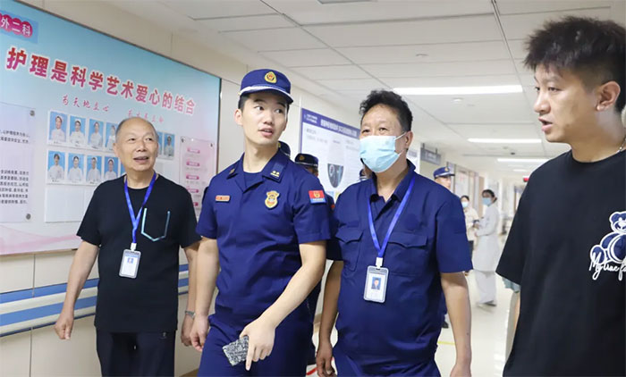 醫(yī)院作為人群密集且設備繁多的特殊場所,消防安全及生產(chǎn)安全關乎眾多生命健康,不容忽視。因此,醫(yī)院的安全管理必須常態(tài)化。為進一步加強消防安全管理工作,推動醫(yī)院安保組織更加健全、安全管理制度更加規(guī)范、風險預警機制更加高效、應急處置機制更加完善,確保醫(yī)院安全平穩(wěn)運行,8月28日上午,上海市閔行區(qū)消防救援局七寶救援站指導員張翔率隊蒞臨上海藍十字腦科醫(yī)院【同濟大學附屬上海藍十字腦科醫(yī)院(籌)】進行消防安全調研指導?倓湛瓶崎L陳正松、副科長汪嘉偉、消防微型消防站站長陳偉智陪同。