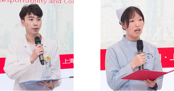 天佑醫(yī)院實(shí)習(xí)生李興長、上海藍(lán)十字腦科醫(yī)院實(shí)習(xí)生卜雪琴作為學(xué)生代表暢談了各自在實(shí)習(xí)中的所見所聞所感,從開始實(shí)習(xí)時的迷茫、自我懷疑到逐漸融入,從實(shí)習(xí)的觀摩學(xué)習(xí)者到護(hù)理工作的參與者,情真意切地表達(dá)了對老師們的感謝,感謝老師在生活中、學(xué)習(xí)中給予的關(guān)懷與幫助,把他們領(lǐng)進(jìn)多彩的護(hù)理道路。