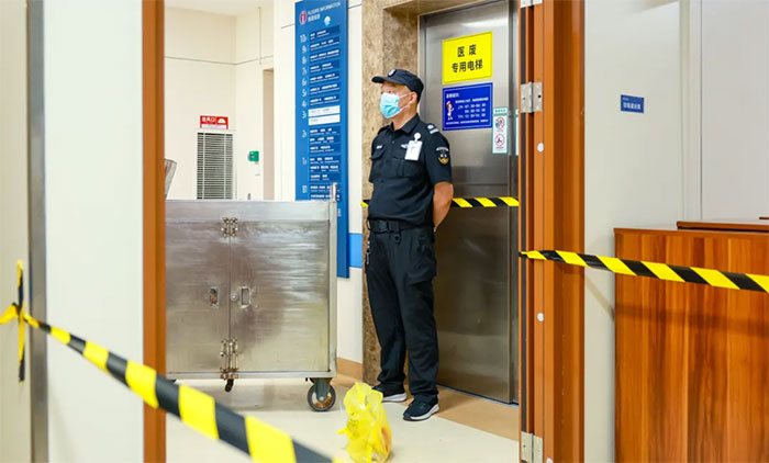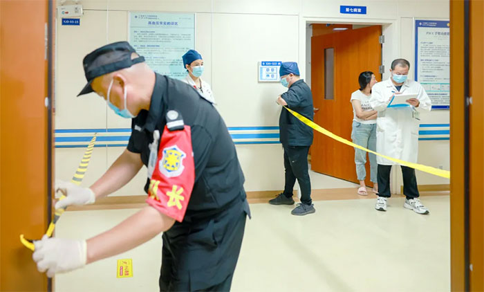15:04 安保人員封鎖現(xiàn)場,禁止無關(guān)人員通行,避免污染物造成人員傷害。潘耀良副院長宣布啟動(dòng)醫(yī)療廢物意外散落事故應(yīng)急處理預(yù)案,各小組迅速做好人員、防護(hù)用品及工具器材準(zhǔn)備。