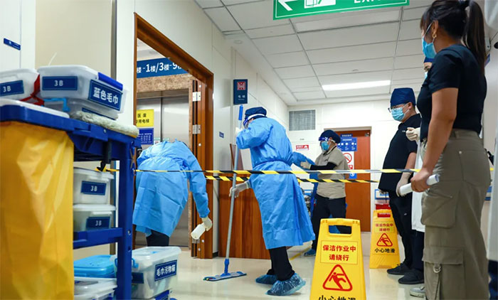 ▲ 保潔人員進(jìn)行地面消毒、清潔