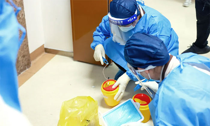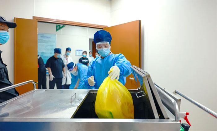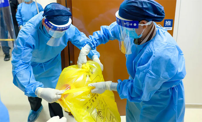 15:10 現(xiàn)場處置人員穿戴好一次性隔離衣、手套、口罩、靴子、帽子、防護(hù)面屏等防護(hù)用品,再行醫(yī)廢收集轉(zhuǎn)運(yùn)。