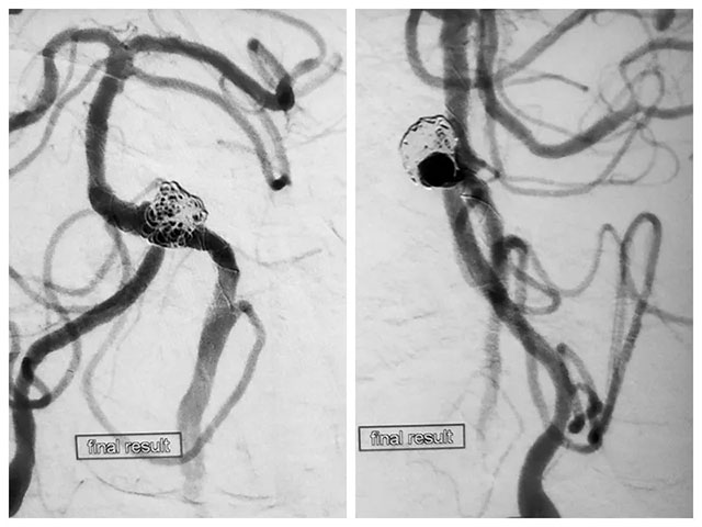 先向瘤體內(nèi)稀疏填入一枚彈簧圈,隨后釋放支架至覆蓋瘤頸,隨后通過(guò)支架網(wǎng)孔繼續(xù)向瘤腔內(nèi)填入數(shù)枚彈簧圈,再次造影見(jiàn)大部分瘤體不顯影。但子瘤內(nèi)仍可見(jiàn)少量血流,通過(guò)支架導(dǎo)管再次釋放一枚支架覆蓋瘤頸,再次造影后見(jiàn)動(dòng)脈瘤無(wú)顯影,撤出系統(tǒng)后行血管造影,未見(jiàn)血栓形成,CT檢查無(wú)出血。