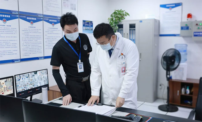 在消控室,朱敏書記和項耀鈞院長仔細查閱安保人員交接班記錄,詳細詢問并檢查安全管理責(zé)任制度的落實,尤其是節(jié)日期間安保消防力量的安排部署情況。院領(lǐng)導(dǎo)再三叮囑相關(guān)負責(zé)人,要嚴格執(zhí)行關(guān)鍵崗位24小時值班制度,確保人員在崗在位;嚴格執(zhí)行信息報告和突發(fā)事件應(yīng)急處置預(yù)案,遇到緊急情況必須及時請示報告,確保節(jié)日期間醫(yī)院安保消防工作平穩(wěn)有序。