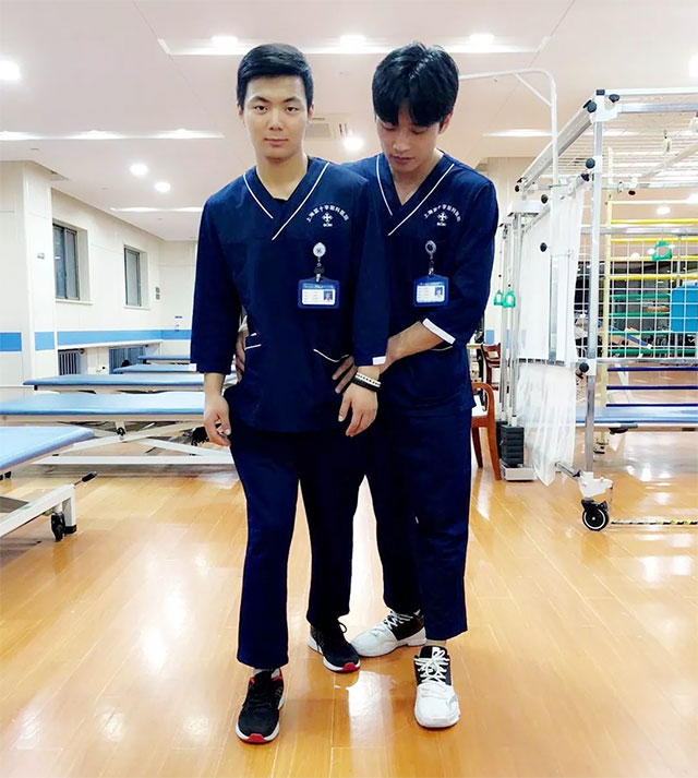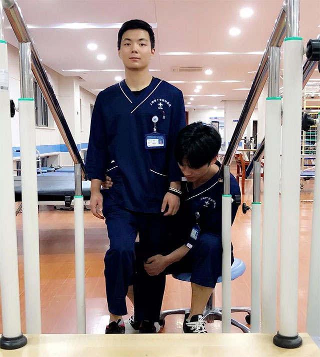下列圖片中,上海藍(lán)十字腦科醫(yī)院神經(jīng)康復(fù)醫(yī)學(xué)科康復(fù)團(tuán)隊模擬演示brunnstrom療法。