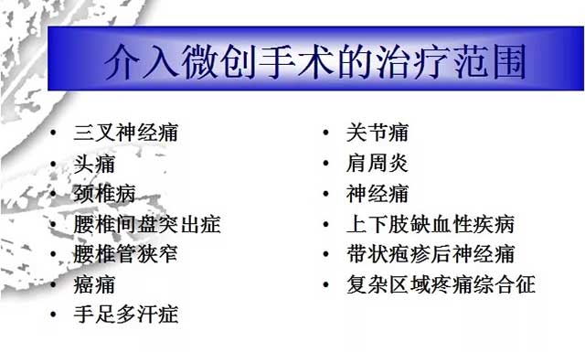 焦國華介紹,介入微創(chuàng)技術(shù)是近年發(fā)展起來的一項新技術(shù),與傳統(tǒng)手術(shù)相比,具有創(chuàng)傷小、出血少、操作安全、經(jīng)濟方便、減少住院時間等優(yōu)勢。目前,疼痛科介入微創(chuàng)手術(shù)的治療范圍已相當廣泛,包括: