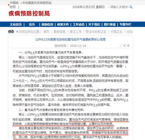 近期,今冬首波重污染天氣襲擊了我國京津冀及周邊地區(qū)。國家衛(wèi)生健康委員會(huì)11月14日在官網(wǎng)發(fā)布《以PM2.5為首要污染物的重污染天氣健康教育核心信息》。核心信息顯示,據(jù)世界衛(wèi)生組織研究,長期持續(xù)的重污染天氣可增加哮喘、支氣管炎、慢性阻塞性肺疾病、肺癌等呼吸系統(tǒng)疾病及高血壓、冠心病、腦卒中等心血管疾病的發(fā)病和死亡風(fēng)險(xiǎn)。