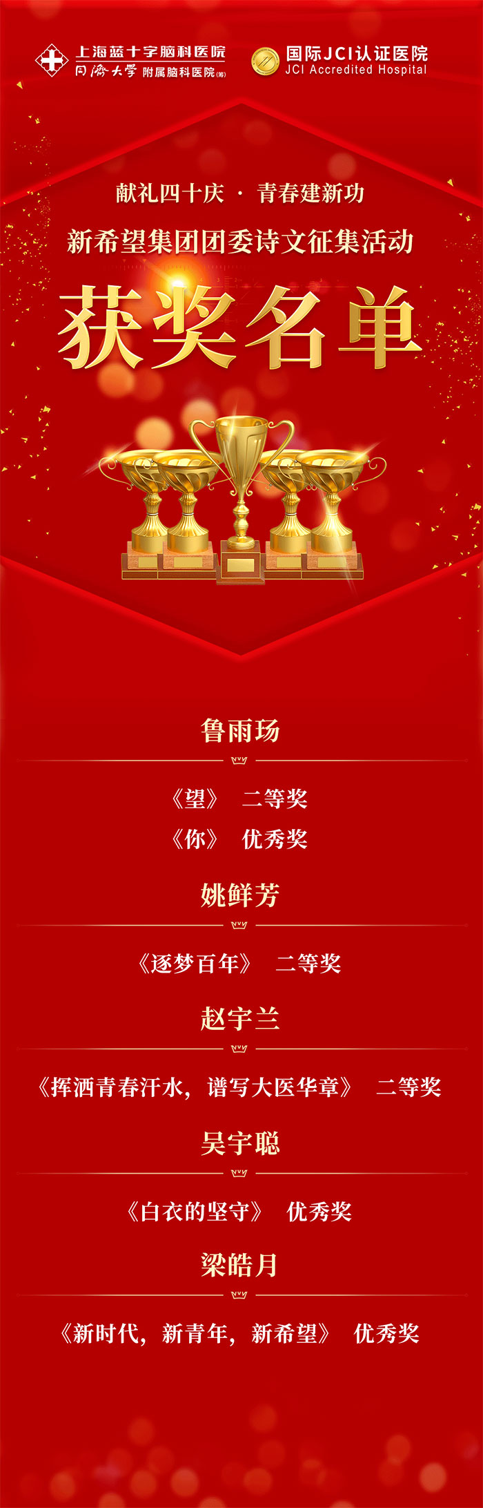 上海藍(lán)十字腦科醫(yī)院高度重視,黨支書、團(tuán)支部積極組織動員,青年員工踴躍投稿參與。經(jīng)新希望集團(tuán)團(tuán)委嚴(yán)格評審,醫(yī)院共有5人6篇作品在此次征文大賽中獲獎。