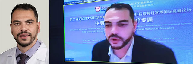 UCM神經(jīng)科主任Shyam Prabhakaran, M.D.首先簡單介紹了芝加哥大學(xué)神經(jīng)科學(xué)中心的12位杰出專家學(xué)者、兩大享譽(yù)世界的神經(jīng)科學(xué)項目、四大神經(jīng)科和神經(jīng)外科中心及項目。隨后以《顱內(nèi)狹窄的藥物治療和介入干預(yù)》為題,從顱內(nèi)動脈粥樣硬化狹窄(ICAD)背景、診斷和機(jī)制、治療選擇、MYRIAD試驗的發(fā)現(xiàn)和展望等方面進(jìn)行闡釋,研究復(fù)發(fā)卒中伴有癥狀的ICAD患者的自然病程;引用之前的介入治療和藥物治療的臨床試驗以減少ICAD患者再發(fā)卒中的風(fēng)險;評估卒中的各種機(jī)制,探索未來針對有癥狀I(lǐng)CAD患者的臨床試驗的潛在治療目標(biāo),同時分析了目前面臨的挑戰(zhàn)。